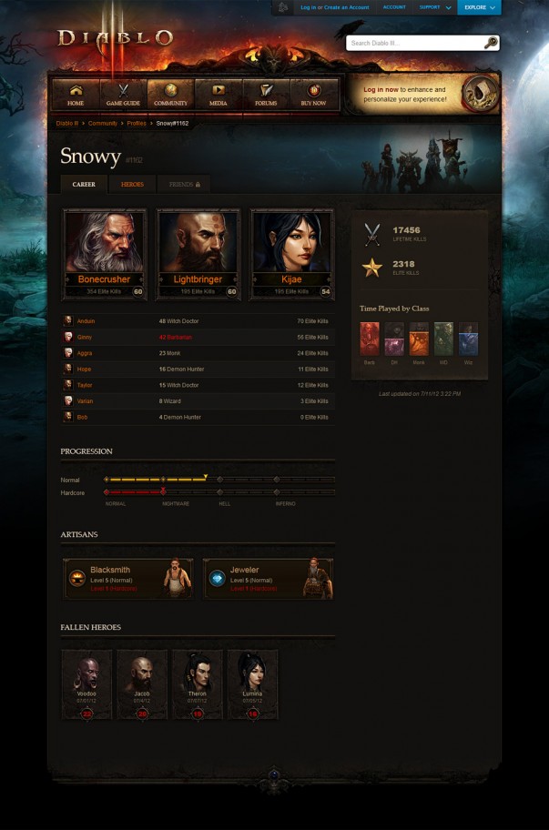 - Track your game progress. How many acts have you cleared? What bosses have you shredded in each difficulty? How far have you leveled up your hardcore and normal artisans? Find out in the Career tab. You can also check your play time (by class) throughout your entire Diablo III career, and learn how many monsters and elites you’ve slain.